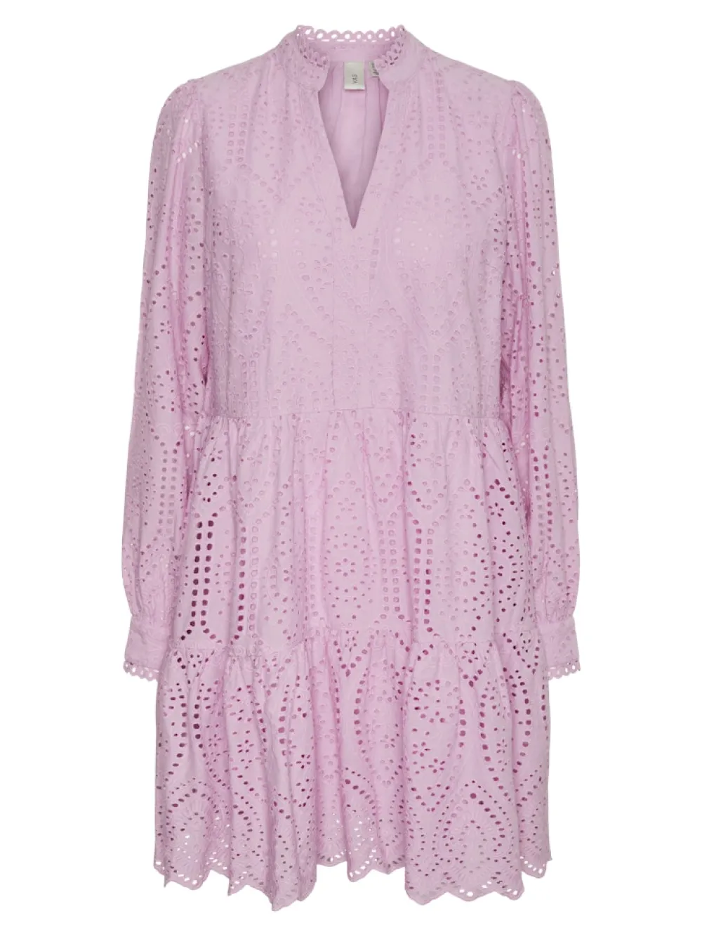 Röyhelöreunainen kiinalaiskaulus, v-pääntie, pallohihat. Hihansuissa röyhelöreunaiset kalvosimet. Kerrostettu helma, jossa brodeerattu siksakmuoto. Mekossa on vuori. Rento istuvuus.
