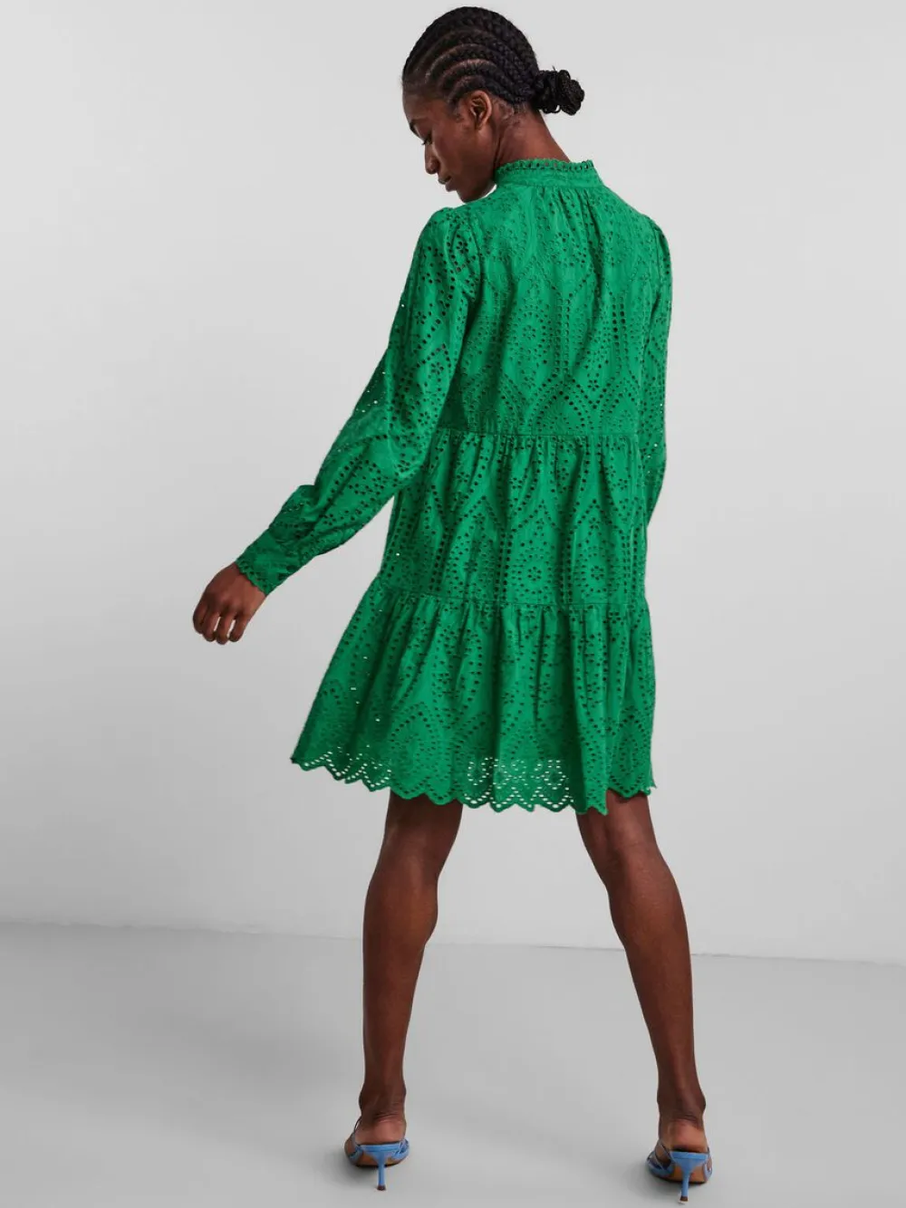 Röyhelöreunainen kiinalaiskaulus, v-pääntie, pallohihat. Hihansuissa röyhelöreunaiset kalvosimet. Kerrostettu helma, jossa brodeerattu siksakmuoto. Mekossa on vuori. Rento istuvuus.