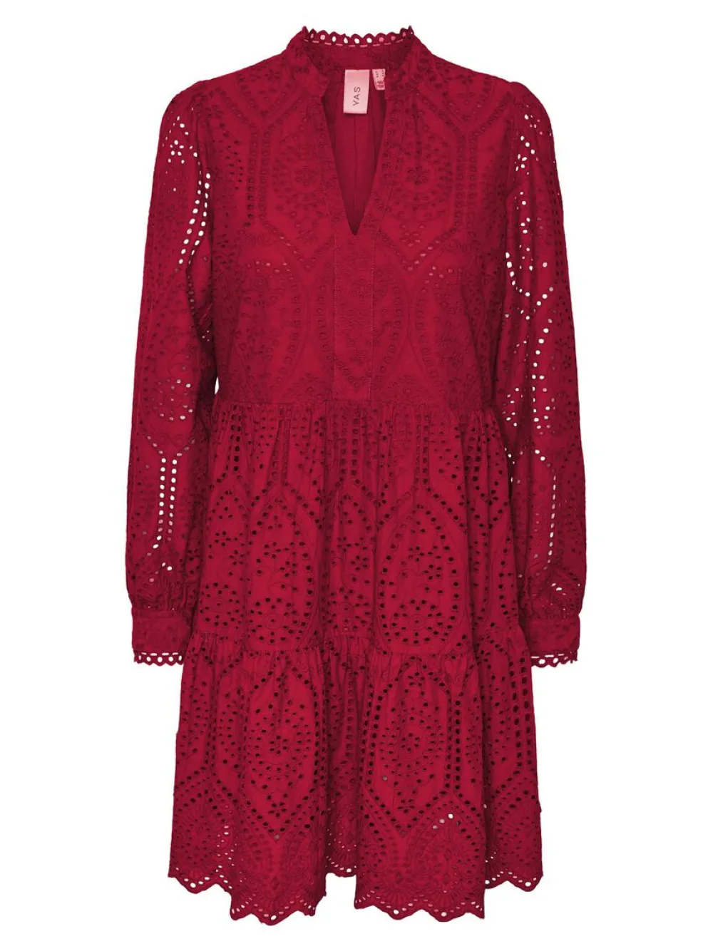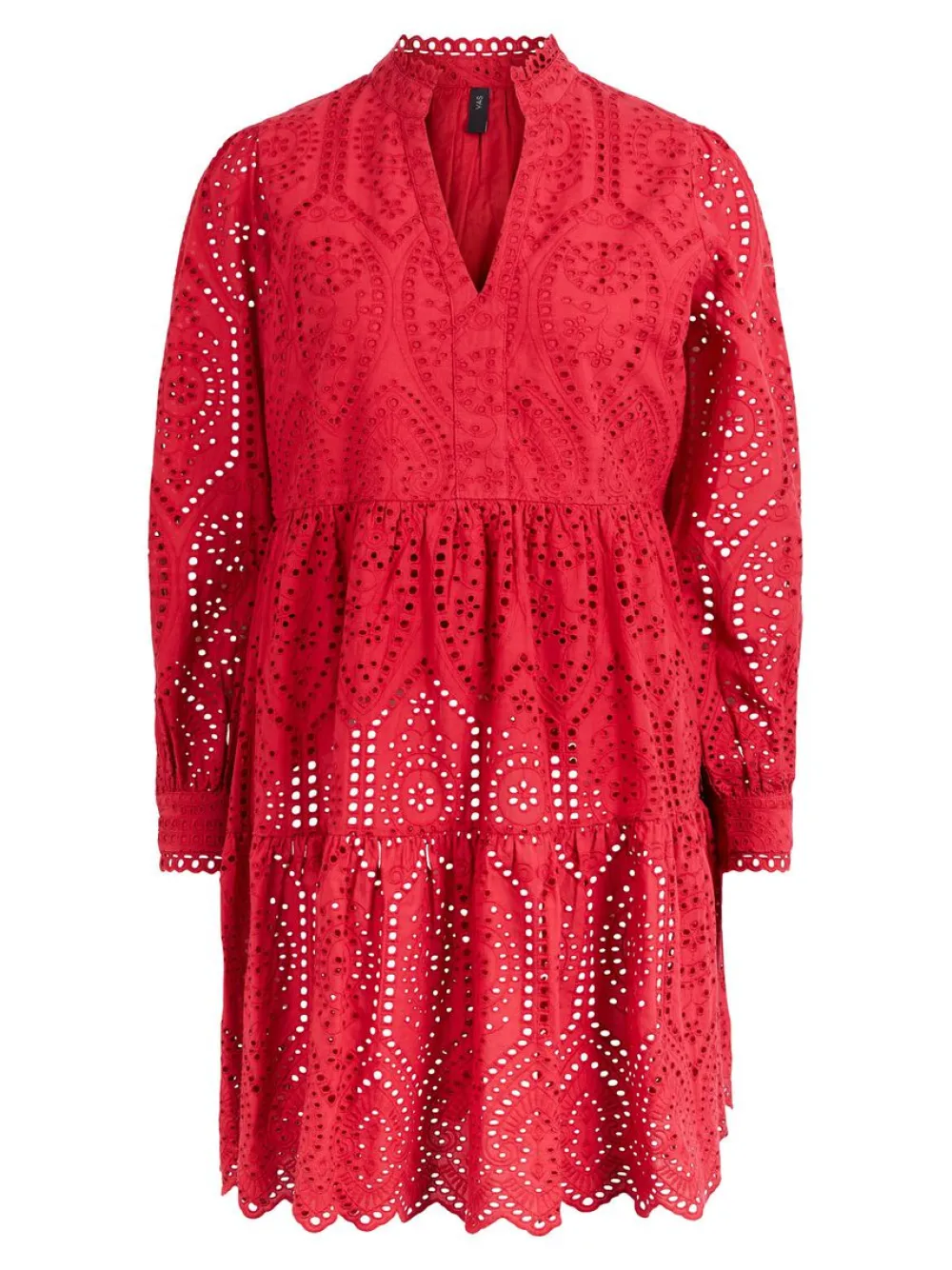 Röyhelöreunainen kiinalaiskaulus, v-pääntie, pallohihat. Hihansuissa röyhelöreunaiset kalvosimet. Kerrostettu helma, jossa brodeerattu siksakmuoto. Mekossa on vuori. Rento istuvuus.