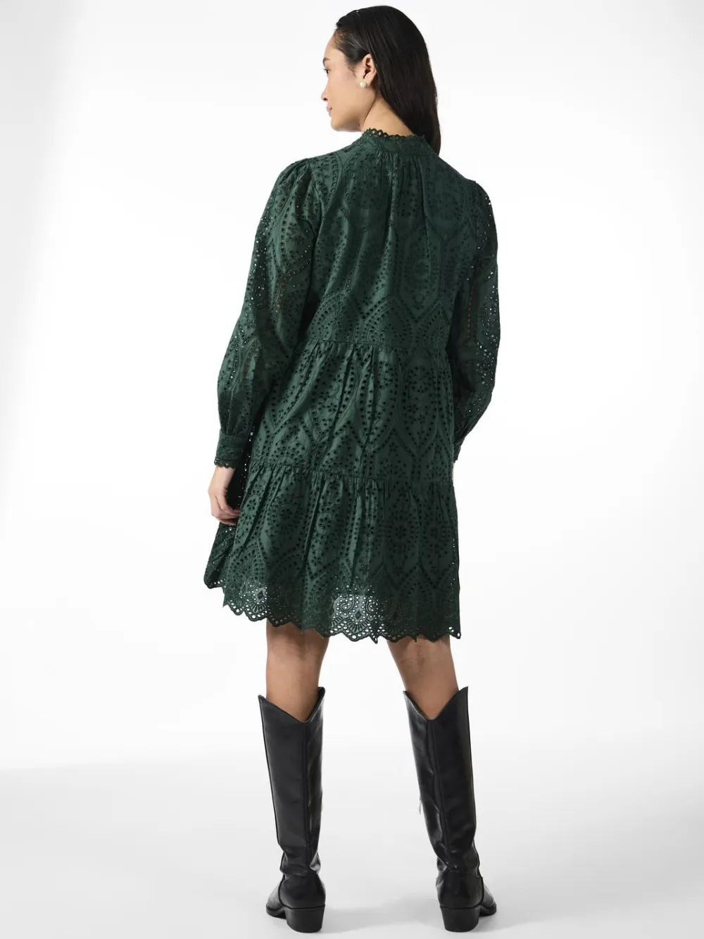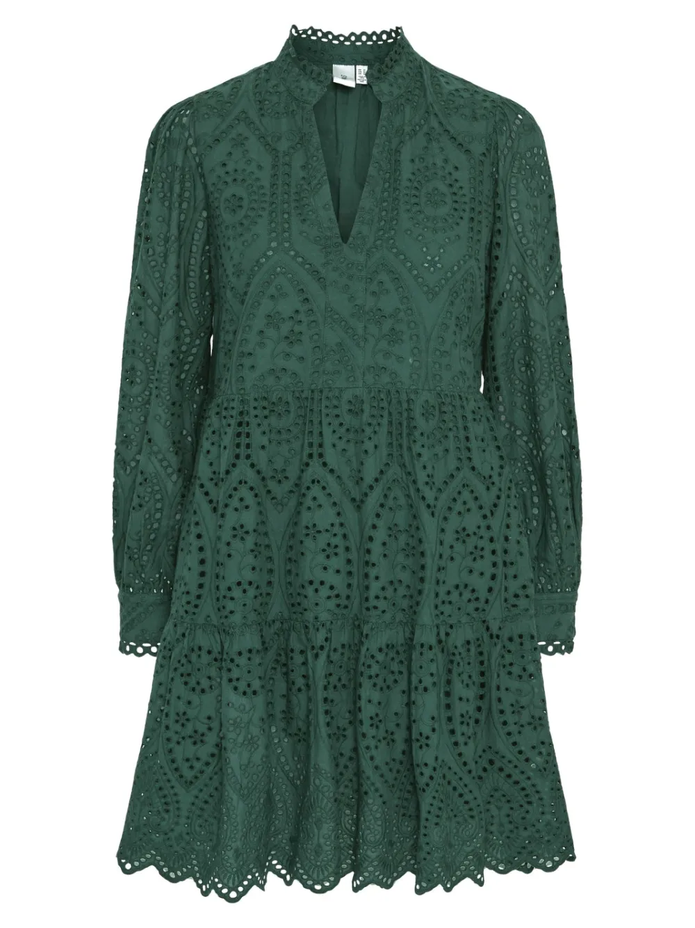 Röyhelöreunainen kiinalaiskaulus, v-pääntie, pallohihat. Hihansuissa röyhelöreunaiset kalvosimet. Kerrostettu helma, jossa brodeerattu siksakmuoto. Mekossa on vuori. Rento istuvuus.