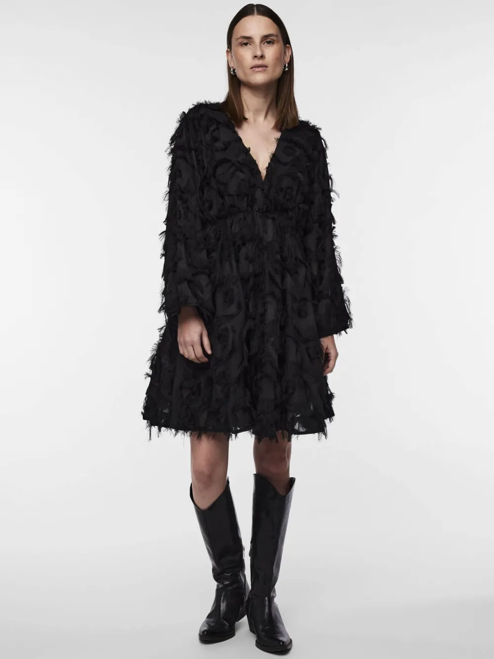 – Teksturoitu minimekko – V-kaula-aukko – Pitkät hihat – Empire-vyötärö – A-linjainen hameosa – Mallilla on yllään koko M