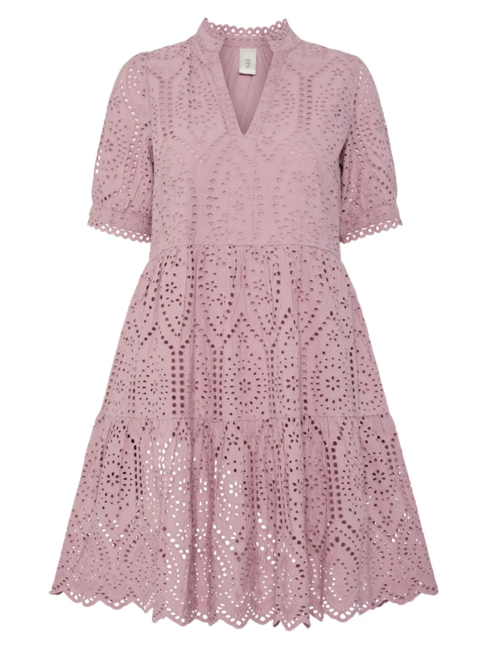 Naisten kaunis minimekko brodeerattua luomupuuvillakangasta. Lyhyet väljät hihat, hieman nouseva kaulus ja edessä v-pääntie. Alaosassa kerroksellisuutta ja ihana piparkakkureunus helmassa. Alla puuvillavuori. Normaali istuvuus. .