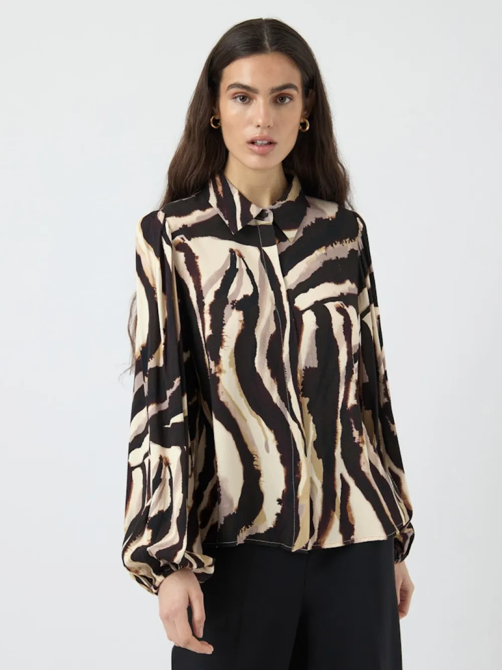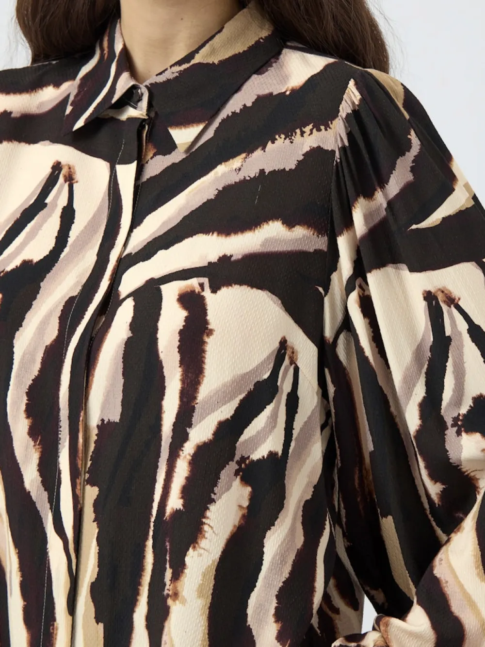 Naisten paitapuserossa on napitus edessä, klassiset kaulukset sekä pitkät hihat. Hihansuissa on kuminauhat, joiden ansiosta hihat asettuvat kauniisti hieman pussittaen. Paitapuserossa on kauttaaltaan näyttävä seeprakuosi. Pusero on valmistettu hengittävästä viskoosikankaasta, joka tuntuu pehmeältä ja myötäilee kevyesti vartaloa.