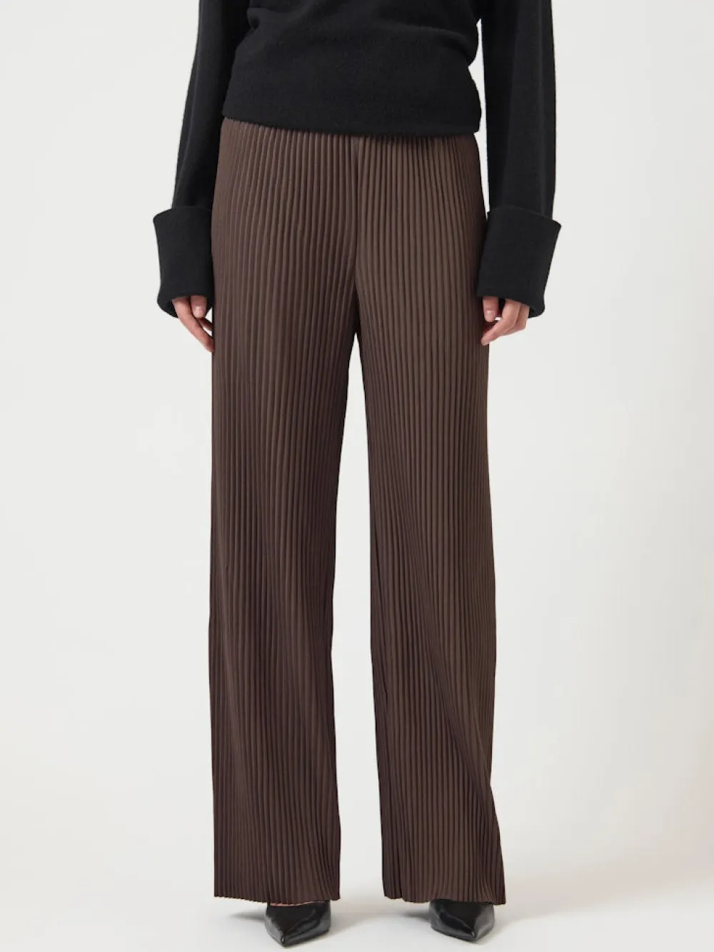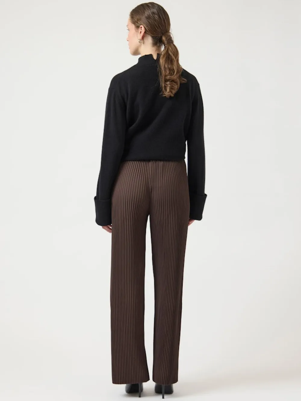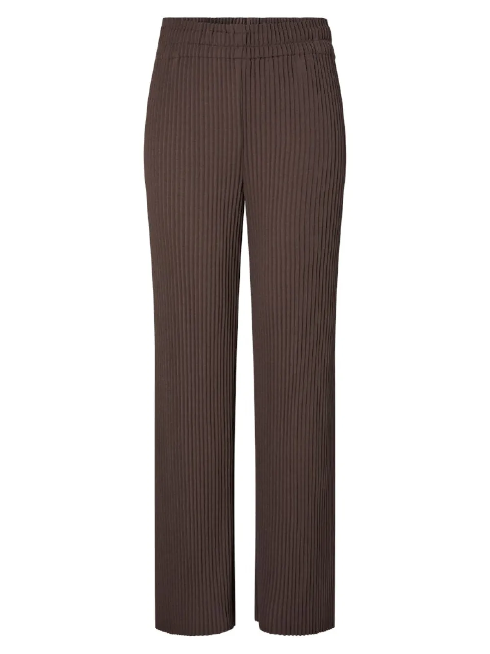 Naisten korkeavyötäröiset housut, joissa yhdistyvät tyyli ja mukavuus! Housuissa on rypytetty joustovyötärö ja niiden materiaali on mukavaa ja joustavaa ribbineulosta. Housuissa on suorat, leveät lahkeet.